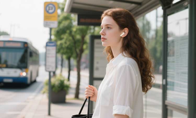 外の音を自然に取り込み。装着したままでも会話やアナウンスを聞き逃しません。