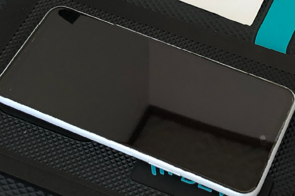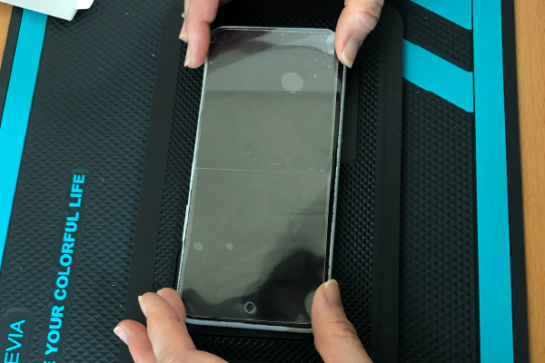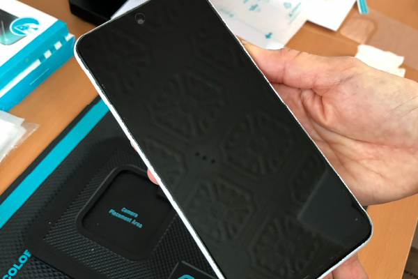 反対側を貼るので、スマホを反対向きに置きます。逆側も同様にしっかりフィルムを折り曲げ、貼り付けを行います。