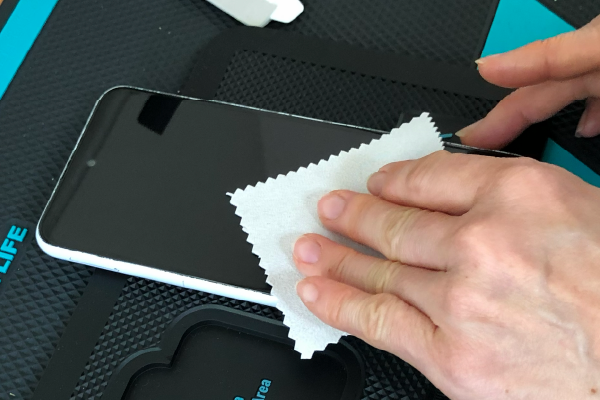 剥がせたら、付属のアルコールクリーナーで画面をしっかりときれいにします。画面が汚れているとフィルムの貼り付けが弱くなる恐れがあります。アルコールクリーナーで拭いた後、付属のファイバークロスでホコリをふき取ります。