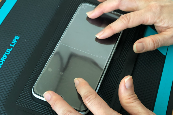フィルム本体の貼り付けを行います。定規などの真っ直ぐなもので抑えながら徐々に接着面を貼り付けていきます。スマホを縦に置き、フィルムの奥側をしっかり起こして90度以上に折ってください。